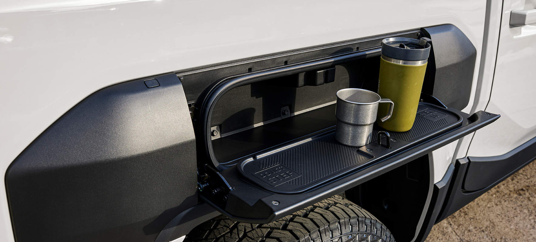 우측 후륜 측면부에 수납공간을 마련하여 자주 사용하는 물건을 보관할 수 있으며 수납공간의 커버는 작은 테이블로도 활용이 가능합니다.